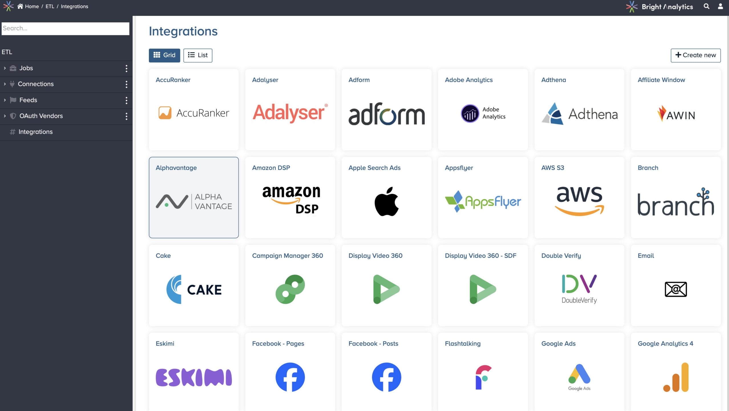 Bright Analytics takes care of the heavy lifting normally required to turn raw marketing data into actionable and valuable insight. Our library of pre-built integrations provides ready-made configurations for the most common analytics use cases – ready for your Analysts to activate.